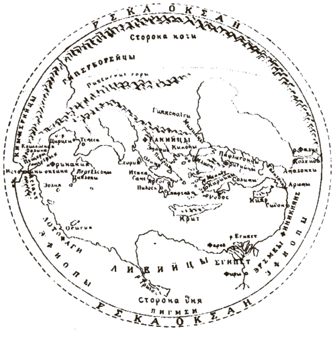 Для начала давайте начертим окружность – фигуру, столь любимую греческими математиками. Разделим очерченный ею круг на три части: Европа, Азия и Ливия (так древние называли Африку, причем Египет или Восточный Египет, вплоть до Нила, часто относили к Азии. – А. Г.). Посредине круга заштрихуем полоску. Это будет Средиземное море и примыкающие к нему моря, почти со всех сторон охваченные частями суши. В свою очередь, круг будет мысленно окружен водой – огромным, объемлющим всё океаном. Вот мироздание в первом и самом общем представлении, каким его видели древние греки.