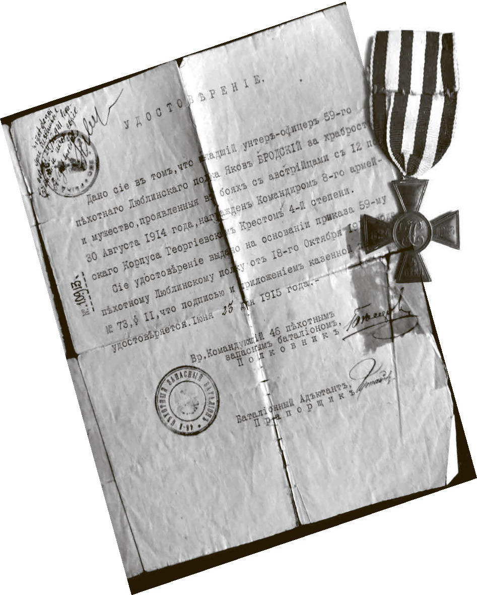 Мой отец, Яков Борисович Бродский, родился в 1887 году. Ему к началу Первой мировой войны исполнилось 27 лет. Он принял участие в войне, которую называли Великой, как вольноопределяющийся. Это была категория военнослужащих, относящихся к нижним чинам, имеющих при этом высокий образовательный ценз, обычно высшее образование, добровольно вступивших в армию и имеющих поэтому льготы, в частности, они допускались в офицерское общество. Кроме того, по истечении определенного времени и сдачи экзамена они могли быть произведены в офицеры. В августе 1914-го отец, уже в чине младшего унтер-офицера, отличился в бою с австрийцами и был награжден Георгиевским крестом 4‑й степени за то, что, будучи ранен в ногу и оставшись в строю, он после гибели командира принял на себя командование взводом и вывел его без потерь из зоны огня.