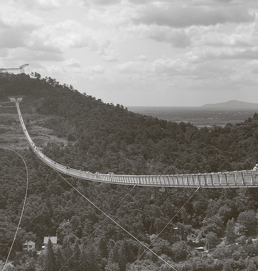 В самом деле, если бы не расположенный неподалеку парк экстремальных развлечений Земплен, то пешеходы, наверное, появлялись бы здесь, на мосту, в год по праздникам. Теперь же туристы, прибывающие в этот парк с лыжной трассой, канатной дорогой, трассой для бобслея и центром скалолазания, непременно хотят еще и пройтись по мосту, который связал две соседние горы — Шархедь и Вархедь, являющиеся частью Токайских гор.