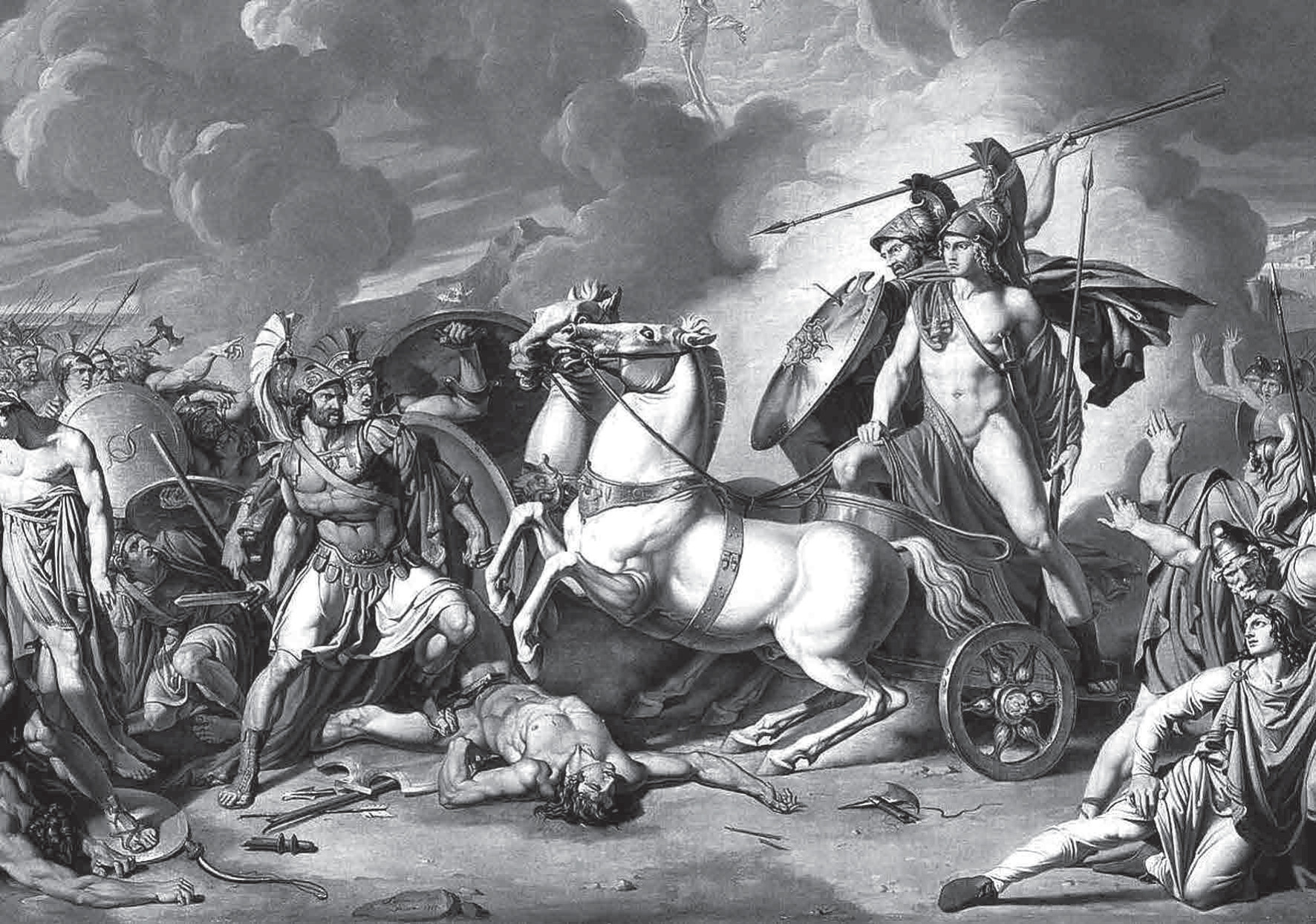 О причинах и начале войны мы узнали из поэм так называемого эпического цикла, в основе которых лежали мифологические сюжеты, объясняющие поступки тех или иных героев и повествующие о некоторых эпизодах боевых действий. Авторы и их слушатели полагали, что война началась с того, что троянский царевич Парис отправился в Спарту, во владения царя Менелая; пользуясь его отсутствием, троянец соблазнил и похитил царицу Елену Прекрасную и привез ее в Трою. Рассерженный Менелай обратился к своему брату, великому микенскому царю Агамемнону, а тот, в свою очередь, к другим владыкам греческих городов. В итоге им удалось собрать войско, в которое оказались вовлечены все великие греческие герои во главе с непобедимым Ахиллесом. Осада Трои длилась девять лет, бои у ее стен шли с переменным успехом. Основные события войны развернулись в начале десятого года. Между Агамемноном и Ахиллесом произошла бурная ссора из-за того, что герои не поделили пленницу. С этого и начинается сюжет поэмы Гомера. Ахиллес затворился в своем шатре и отказался участвовать в сражениях. Этим воспользовались троянцы: правильно оценив обстановку, они вышли из города, напали на греков и стали теснить к морю, где был разбит греческий лагерь. Греки обратились к Ахиллесу, но тот продолжал капризничать. Вместо него на бой вышел его друг Патрокл, которого убил «главный герой» троянцев, сын царя Приама Гектор. Обуреваемый скорбью и жаждой мести Ахиллес вышел на бой с троянским царевичем, в жестокой схватке одолел Гектора и вознамерился надругаться над его трупом. Однако царь Приам, тайно посетивший шатер Ахиллеса, воззвал героя к состраданию и вымолил тело сына. «Илиада» Гомера кончается сожжением тела Гектора у стен Трои. Таким образом, в ней описаны события всего нескольких дней.