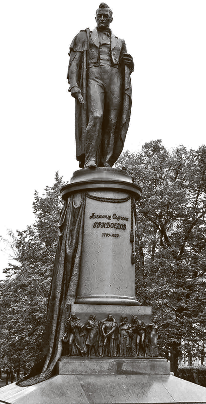 Памятник А. А. Мануилова в начале Чистопрудного бульвара в Москве – оттепельный, того же ряда, что театр-студия «Современник», появившийся в год открытия памятника, в 1959‑м, на Триумфальной площади. Этот памятник, с фигурками героев комедии «Горе от ума» у ног классика – лучшее выражение студийного театра: задумчивость драматурга, наложение узнаваемых амплуа на узнаваемые роли, отдернутый занавес, показывающий демократизм студийных постановок. Хотя появление сначала стелы в честь Грибоедова, а потом и величественного памятника – результат стечения случайных обстоятельств, тем не менее памятник лучше всего выразил дух писателя: никогда не быть одному и всегда сопротивляться любой монополии: монополии на слово, на дело, на власть над обстоятельствами. Гладкому литературному слову Грибоедов противопоставлял вспышки остроумия, слишком казенным проектам – точную наблюдательность, бюрократической исполнительности – многоязычие, шаблонной отчетности – хитрости дипломата. Можно и нужно сказать, что он был антимонопольным гением нашей русской литературы.