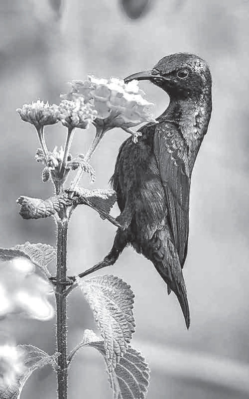 Хожу с оптикой наготове по тропинкам и полянкам, выслеживая местных птиц. Самые характерные из них – это воробьи, кольчатые и малые горлицы, бюльбюли и нектарницы. Последних, азиатских, или пурпурных, нектарниц (Cinnyris asiaticus), я люблю больше всего. Это самые маленькие из всех африканских и азиатских нектарниц, длина их тела всего около 7,5–8 см. Самочки у них скромненькие, с темной или бурой спинкой и желтым брюшком, а самцы – красавцы хоть куда: сами темно-синие, перламутровые, отливающие на солнце металлическим блеском. Это все результат полового отбора: самцы в глазах своих избранниц должны выглядеть неотразимо!