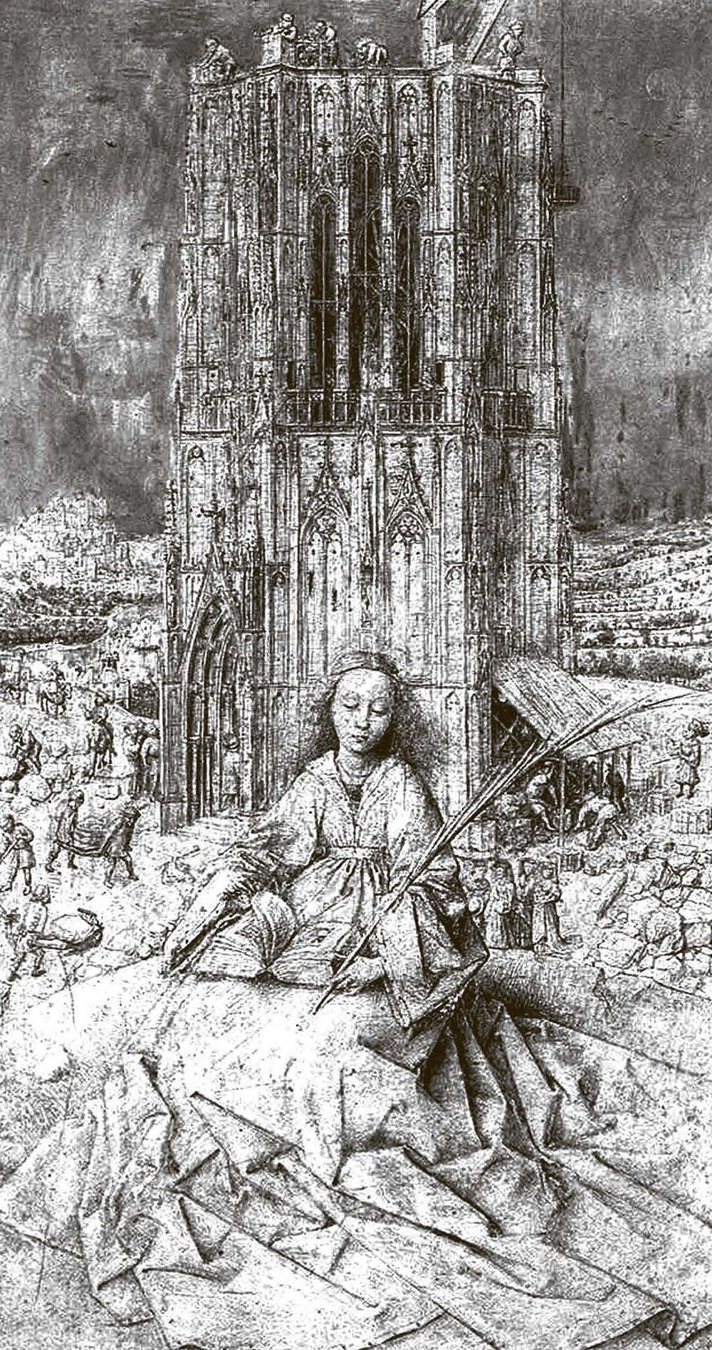 Вспомним его «Святую Варвару» (1437). Мученица из Никомидии в Малой Азии была казнена собственным отцом, крупным римским чиновником, за принятие христианства. По версии жития, она была заточена отцом в башню от посторонних взоров, и в башне было два окна суровой античной симметрии. Но Варвара велела проделать третье окно, исповедуя Троицу: на смену симметрии пришло подвижное равновесие прорыва к невозможному. Изобразить столь драматичное житие в одном пространстве невозможно: как показать, что третье окно – не то же, что первые два? Что с Варварой многое случилось, что она сама пересоздала себя? Ван Эйк сделал просто: он изобразил Варвару на фоне строившегося тогда Кёльнского собора: мы видим и работу подъемных механизмов, и укладку кирпичей, и замешивание глины, и суету с носилками. Это полная панорама строительных технологий того времени. Поэтому святая Варвара сама становится строительницей храма, сама создает исповедание Троицы в камне – проблема изображения процессов и процедур решена.