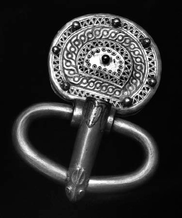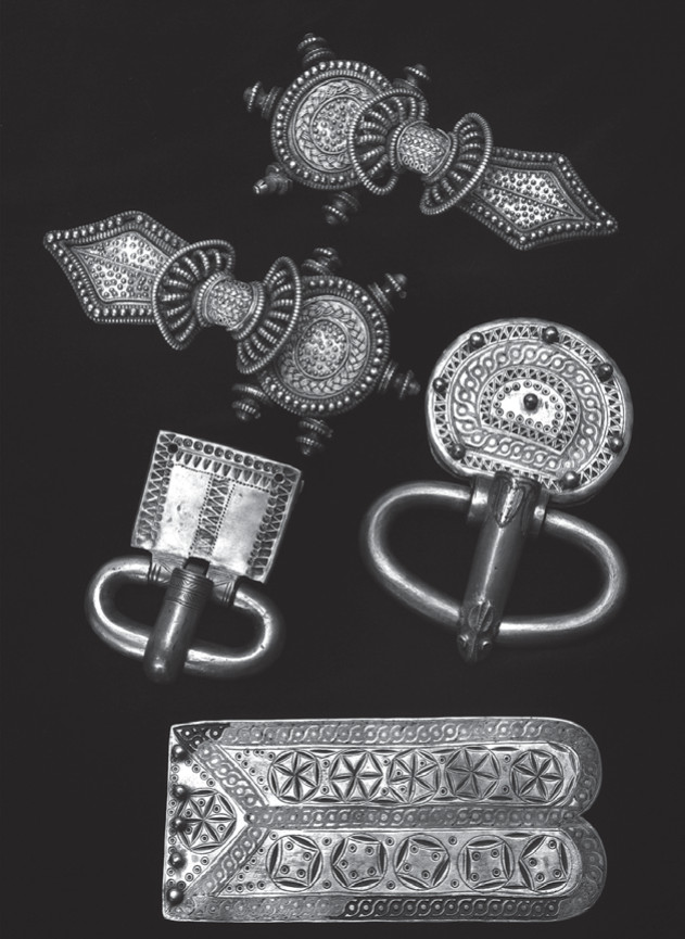 Пряжка из клада в Замости крупная и массивная, с толстым язычком, конец которого имитирует голову зверя. В паре с пластиной – наконечником ремня они демонстрируют стилеобразующее триединство серебро – позолота – чернь, весьма эффектно передающее в общем-то незамысловатый геометрический орнамент (рис. 1а, 1б). Крупные двупластинчатые застежки соответствуют характерным традициям германцев. Фибулы данного типа, но поскромнее, часто попадаются в захоронениях и кладах Северной Европы, однако украшений столь высокого художественного уровня и такой изящной работы известны лишь единицы. Археологи склоняются к мысли, что это произведения высококлассных римских ювелиров. Фибулы из Замости могли быть изготовлены и отосланы в качестве дара вандальской княгине с вполне определенной целью. От нападений на дунайский лимес гуннов часто отвлекали конфликты на севере, ведь подчиненные народы не всегда покорно склоняли головы. И поэтому часть продукции барбарикарий уходила к племенам, которые в нужный момент поднимали восстание в тылу у кочевников. А может, и родственные связи Стилихона повлияли на судьбу этих уникальных вещей.