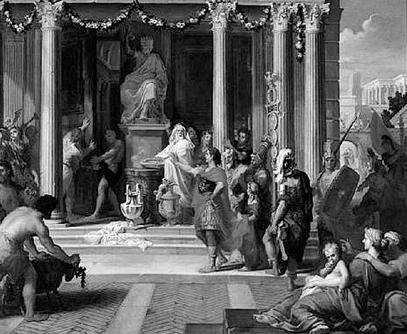 Август закрывает двери храма Януса. Художник Луи де Булонь Младший. 1681 год. Эта церемония, состоявшаяся в январе 29 г. до н.э., означала, что в Римской империи воцарился мир