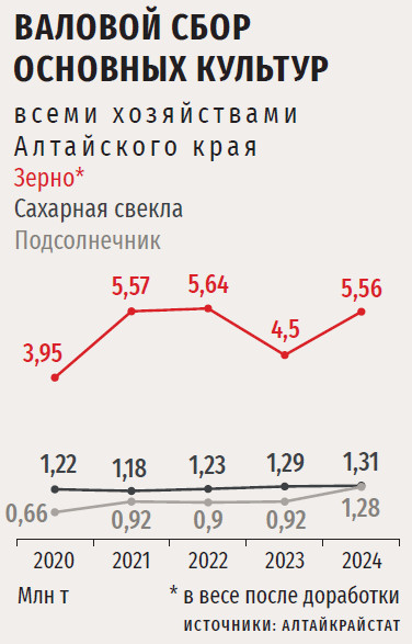 Шабаров утверждает, что реализация зерновых и зернобобовых культур в регионе стабильно растет, в текущем году — даже опережающими темпами. Согласно данным Алтайкрайстата, за первые пять месяцев 2025 года сельхозорганизации реализовали почти 1,2 млн т зерновых и зернобобовых культур, или на 64,4 % больше, чем за аналогичный период предыдущего года. В 2024-м прирост к уровню 2023-го составил 3 %, а в 2023-м к 2022-му — 6,3 %. Экспорт зерна из края, согласно информации Алтайского филиала ЦОК АПК, в прошлом году достиг 468 тыс. т. Регион — лидер прошлых лет по поставкам пшеницы на экспорт среди всех субъектов Сибири, а в 2024-м переместился на третье место.