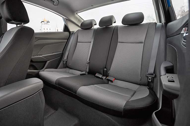 «Солярис» подрос в ширину и длину на 30 мм (соответственно до 1700 и 4405 мм), неизменными остались клиренс (160 мм) и высота автомобиля (1470 мм). На кузове никаких стреловидных выштамповок и резких граней. Новая решетка, забегающие на крышку багажника фонари и более пропорциональный и сбалансированный силуэт заставляют вспомнить о старшем родственнике, седане Elantra. Их родство внешностью не ограничивается, но об этом чуть позже. Трехсантиметровый прирост внешних габаритов, как, впрочем, и аналогичное увеличение колесной базы (до 2600 мм), несильно отразились на салоне. На задних рядах все так же для ног вполне достаточно места, но его чуть не хватает по высоте, и прибавка в 3 мм между подушкой дивана и потолком ничего не меняет – особо долговязые граждане помнут прическу об обивку потолка. Зато холодно не будет – Solaris впервые предлагает двухступенчатый подогрев заднего ряда (опция).
