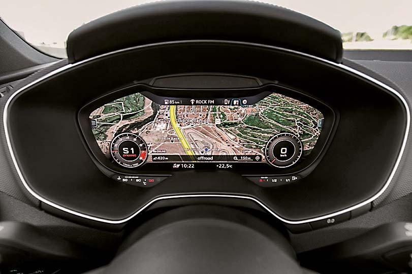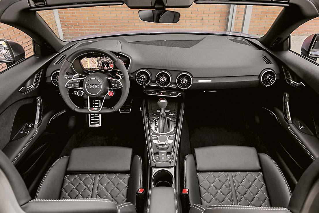 Интерьер ТТ с приставкой RS практически не отличается от менее злой Audi TTS. Разве что за счет небольших штрихов вроде красной кнопки на руле и карбоновых вставок на передней панели салон смотрится агрессивнее и «острее». Кроме того, для версий RS фирменный виртуальный кокпит получил расширенный функционал. Так, на дисплей, помимо данных о скорости и подсказок навигационной системы, выводится информация о давлении в шинах, распределении тяги по колесам и о боковых нагрузках. И это только добавляет азарта!