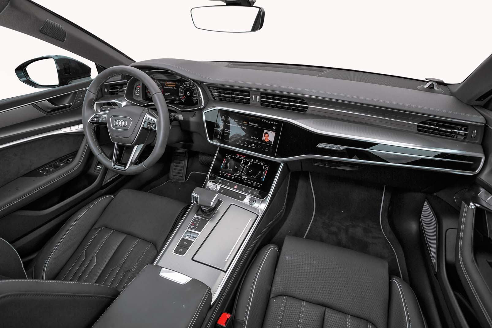 Интерьер Audi A7 – эстетика в чистом виде. Утонченный, стильный и очень удобный. В официальном описании модели слова «инновационный» и «передовой» встречаются часто. И, пожалуй, это именно тот случай, когда столь частое употребление таких эпитетов полностью оправданно. Ведь салон Audi A7 действительно смотрится очень круто. Управление функционалом возложено на два сенсорных экрана – так же, как и во флагманском седане Audi А8. В Audi A7 можно вывести на верхний дисплей 3D изображение с внешних камер и менять угол обзора. Интересная «фишка», которая помогает парковаться с точностью до миллиметра. Можно активировать режим ночного видения (изображение выводится на цифровую приборную панель). «Инновационного» оборудования много. И не только в дорогих версиях, как наша.