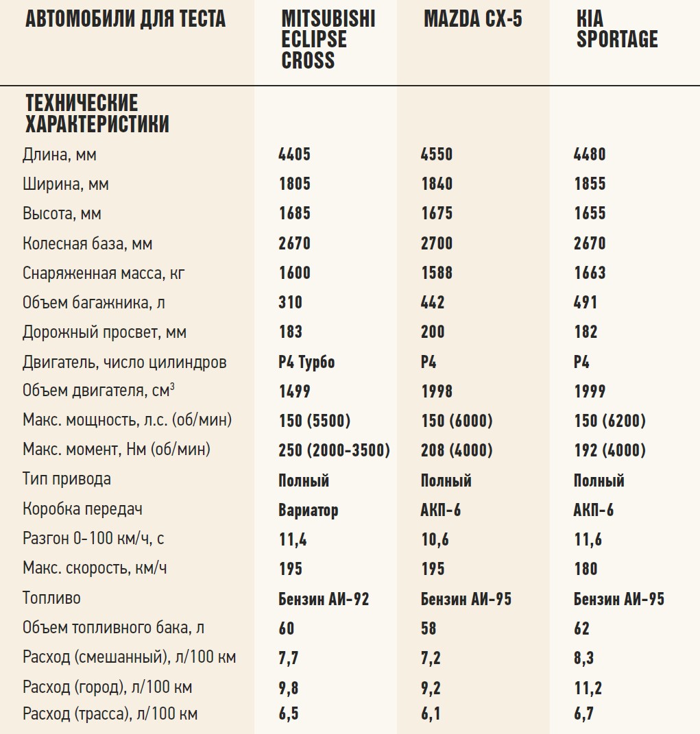 Дело за малым – выяснить, который из трех автомобилей быстрее, проворнее и комфортабельнее на ходу. Невзирая на наличие у каждого из них системы полного привода, мы решили ограничить тестовую программу упражнениями на асфальте, ввиду того, что на внедорожные подвиги трансмиссии кроссоверов не рассчитаны. Небольшая разница в весе и равенство заявленных сил – у всех по 150, обещали нам упорную борьбу в спринте. Но только Mazda и Kia закончили зачетный 400-метровый участок ноздря в ноздрю. Mitsubishi благодаря более тяговитому турбомотору обогнал обоих соперников на целый корпус! Не сказать, что проигравшие совершенно лишены темперамента. В городе и на скоростях до 120 км/ч возможностей их двигателей хватает вполне, но обгоны на шоссе Eclipse Сross исполняет увереннее и легче. Удобство управления тягой, цепкие тормоза и хорошая шумоизоляция также идут ему в плюс, а вот мягкость настроек шасси скорее в минус. Пружины и амортизаторы исправно разглаживают небольшие неровности, но пропускают удары от глубоких ухабов, а главное – допускают заметные крены кузова в поворотах и небольшое рыскание на скоростной прямой.