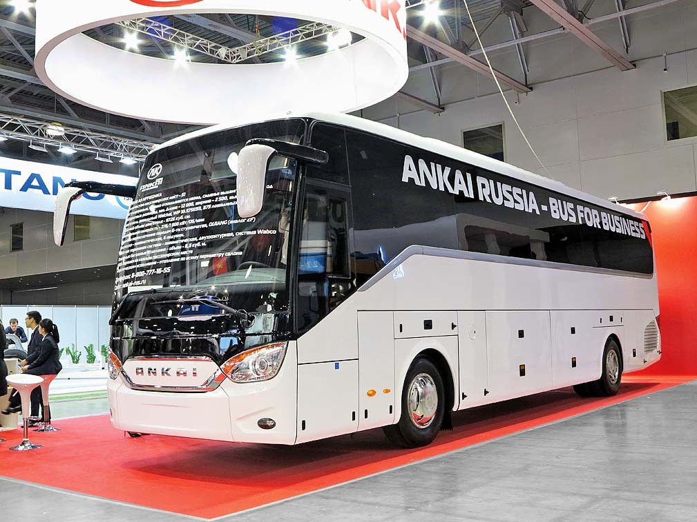 Название бренда ANKAI – аббревиатура из двух слов. Anhoi – это провинция, в которой расположен завод и немецкого бренда, Kassbohrer – родоначальник автобусов SETRA. Сейчас компания входит в группу JAC и имеет три сборочные площадки. Все кузова автобусов проходят оцинковку и катафорезную обработку. На выставке был представлен первый 12-метровый туристический автобус ANKAI A9 на 51+1+1 мест. В отличие от SETRA он полностью собран из китайских узлов и агрегатов. Силовая установка – 9,7-литровый дизель Weichai (375 л.с.) с шестиступенчатой МКП Qiyianq. Пневмоподвеска на шести подушках.