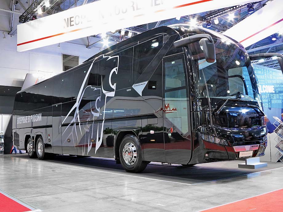 Компания показала два автобуса – 12-метровый междугородний MAN Lion’s Coach и 14-метровый туристический VIP-лайнер Neoplan Tourliner. Первый вмещает 49 пассажиров, силовой агрегат 440 л.с. с 12-ступенчатой АКП. Второй – с колесной формулой 6х2, он на 20 л.с. мощнее и рассчитан на 59 пассажиров. Оба автобуса оснащены самыми современными на сегодняшний день системами безопасности и комфорта.