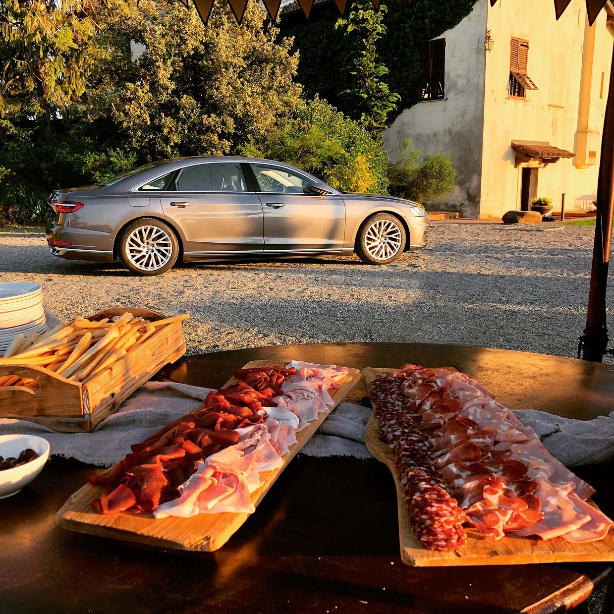 От миланского аэропорта до первой точки нашего путешествия, виллы Спарина, отправляемся на новом Audi A8. И эти первые 150 км пути – уже как детокс от будней, суеты и проблем. Кресла, обитые кожей тончайшей выделки, с функцией массажа убаюкивают. Чистота и выверенная простота линий в интерьере благодатно действует на глаза. Воздух, пропущенный сквозь систему очистки и ионизации, заставляет вновь дышать полной грудью. Но главное – это пейзажи за окном: изумрудные поля, самобытные деревеньки, виноградники.