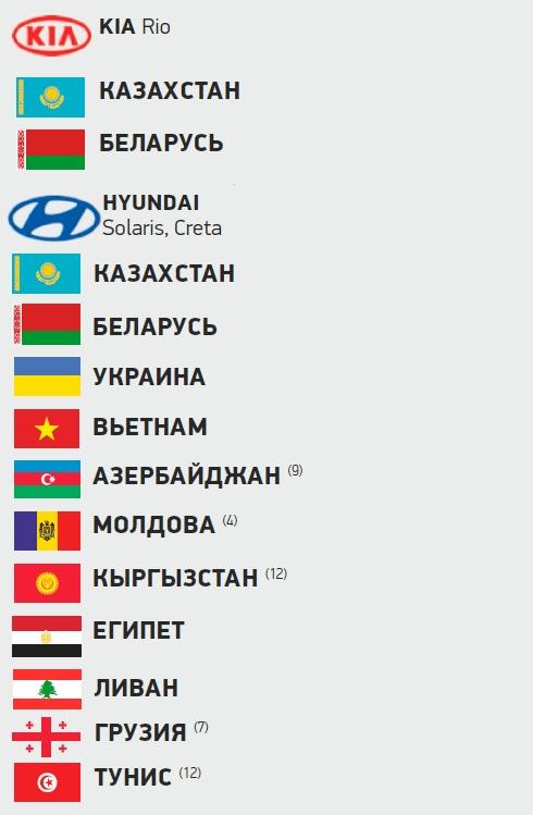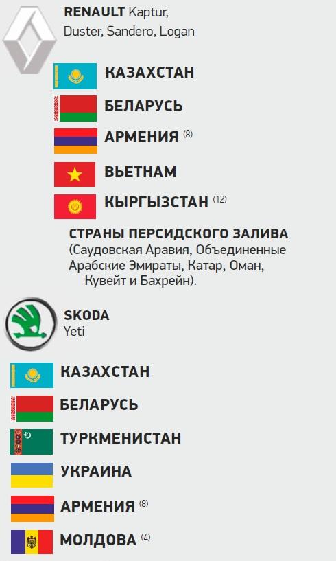 Так, в июне 2017 года компания Renault начала поставки автомобилей Duster в страны Совета сотрудничества арабских государств Персидского залива (Саудовская Аравия, Объединенные Арабские Эмираты, Катар, Оман, Кувейт и Бахрейн). Налажен экспорт в государства Ближнего Востока и Африки, такие как Ливан и Египет. На рынках этих стран продаются автомобили марок Hyundai, Datsun и Lada российской сборки. А география экспорта продукции «АвтоВАЗа» впечатляет еще больше – автомобили Lada поставляются в 30 разных государств.