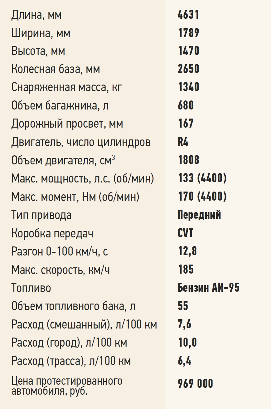 Судя по цене – от 879 990 рублей – машина явно не цепляется за бюджетный сегмент. И это, между прочим, базовая комплектация с МКП без медиасистемы. У нас же автомобиль с вариатором в комплектации Luxury c отделанным на хорошем среднем уровне салоном, который не пахнет новыми игрушками, не гремит и не прогибается пластиком под пальцами рук.