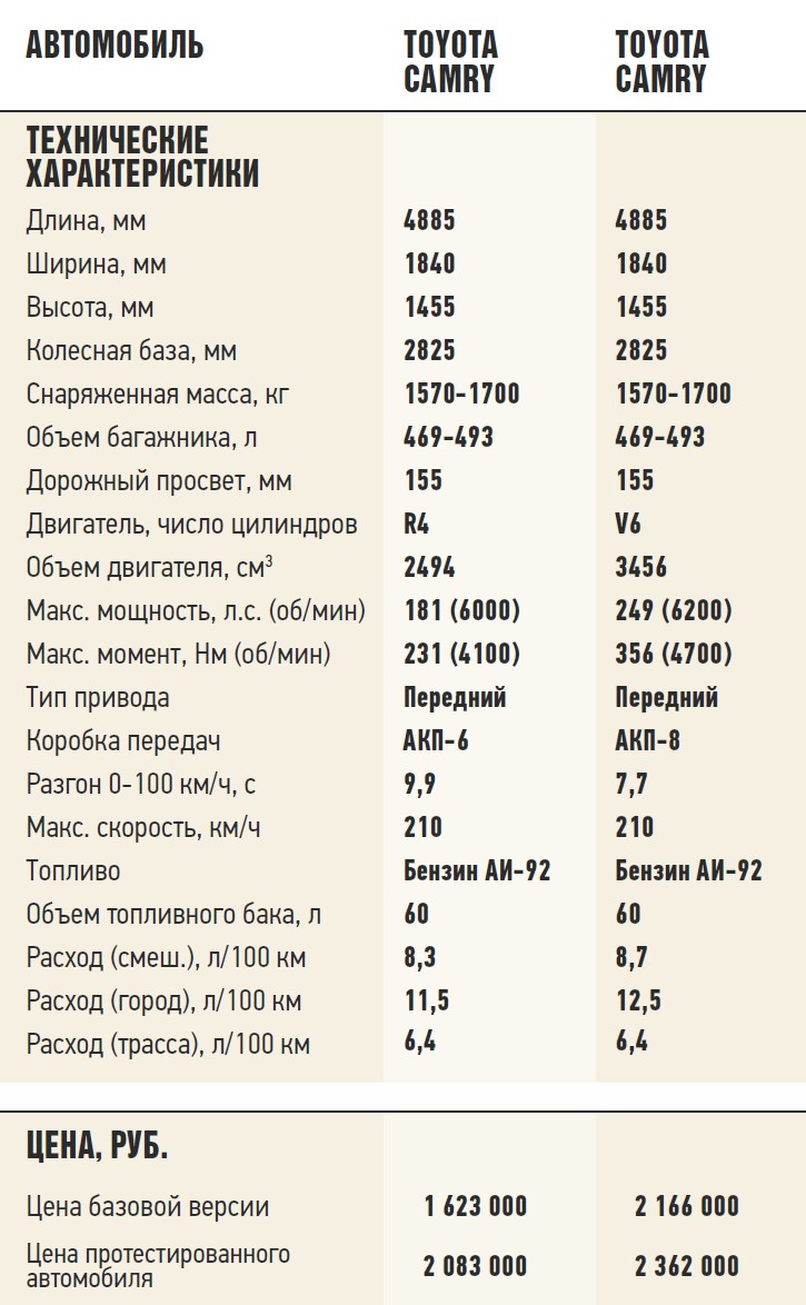 Для Camry доступны три силовых агрегата – «четверки» объемом 2,0 л (150 л.с.) и 2,5 л (181 л.с.) работают в паре с 6-ступенчатой АКП. Мотору 3.5 мощностью 249 л.с. полагается 8-ступенчатый автомат. Новая коробка вкупе с двойной системой изменения фаз газораспределения позволяет обеспечивать экономичность на приемлемом уровне при езде в спокойном темпе. Но разве для этого создан бодрый V6? В стремлении сэкономить лучше обратить внимание на «четверки». Мотор 2.5 – именно то, что правильно назвать «золотой серединой».