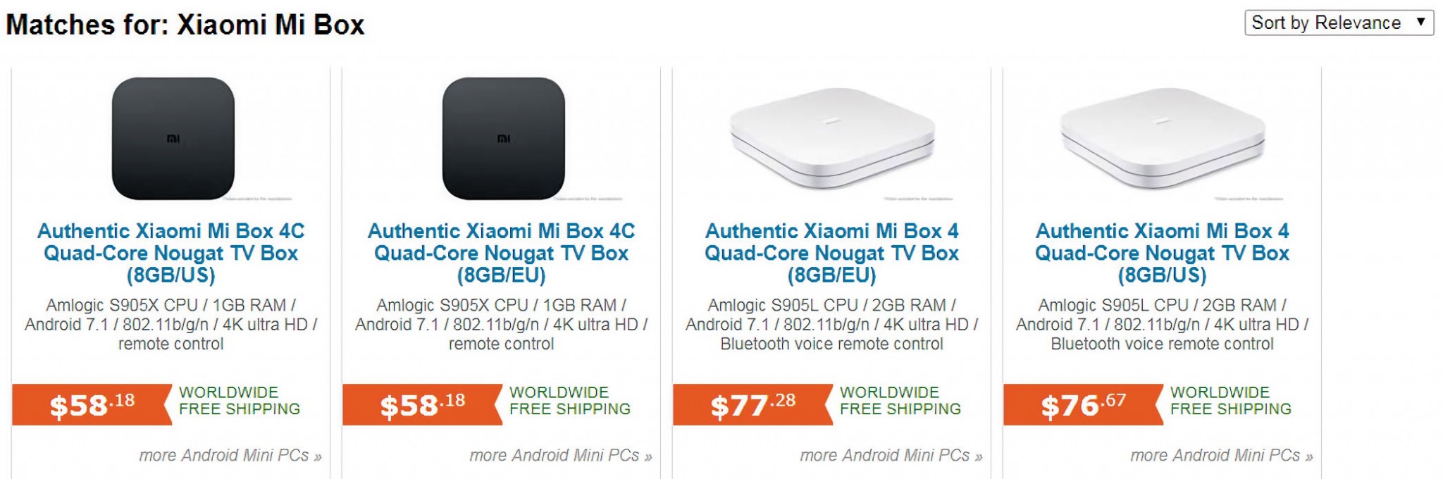 Xiaomi Mi Box, как и другая популярная электроника, представлена на всех упомянутых площадках, и на каждой версии разграничены по-своему. В качестве примера рассмотрим сервисы AliExpress и Fasttech. Так, Fasttech в результатах поиска выводит топ-5 разных версий приставки, отсортированных по релевантности. Этот гипермаркет позаботился о том, чтобы мы не перепутали версии: в конце названия видно отметку вида «8GB/ US», означающую, что это международная версия с блоком питания под американскую розетку с 8 Гбайт внутренней памяти. А вот в нижнем ряду представлена та самая «Chinese Version», которая нас не интересует. Также здесь видно, что второй результат в списке — Xiaomi Mi Box 4C с европейской вилкой — на момент написания статьи находится в стадии предзаказа. О предзаказе сообщает соответствующая отметка на странице товара. Так что переключаемся на предыдущее поколение (его можно найти далее в перечне результатов поиска или прямо на странице товара в выпадающем списке model).