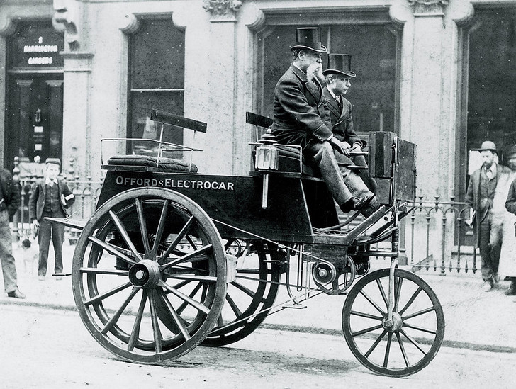 В это сложно поверить, но предок современного электромобиля появился раньше, чем машина с двигателем внутреннего сгорания. Первая самоходная тележка с электромотором была создана еще в 1842 году. А в 1899-м в Петербурге русский дворянин и инженер Ипполит Романов создал один из первых русских электромобилей. Конструкцию он скопировал с английских кебов: извозчик сидел на возвышении позади своих пассажиров. Четыре колеса, передние больше задних; свинцовый аккумулятор требовал подзарядки каждые 60 верст, а мощность составляла 4 л. с. Повозка разгонялась до 37 километров в час.