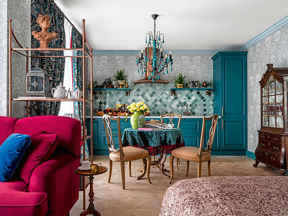 Основной цвет интерьера — бирюзовый разной степени насыщенности, от блёклого в обоях до интенсивного с синими вкраплениями в мебели и аксессуарах — воспринимается и празднично, и умиротворяюще