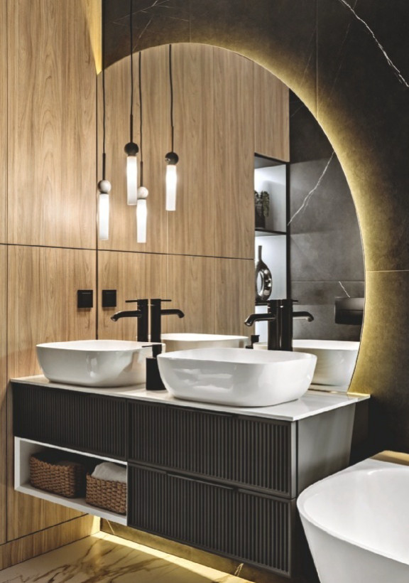 Пространство ванной комнаты представляло собой вытянутое помещение со смещённым к краю входом. Такая конфигурация усложняла возможность эргономичной планировки, но в итоге дизайнеру удалось разместить всё необходимое для создания современной и комфортной ванной комнаты. Санузел получился одновременно эстетичным и функциональным. За фасадами изготовленных на заказ шкафов помимо систем хранения скрыты все технические узлы: система очистки и умягчения воды, коллекторы и система