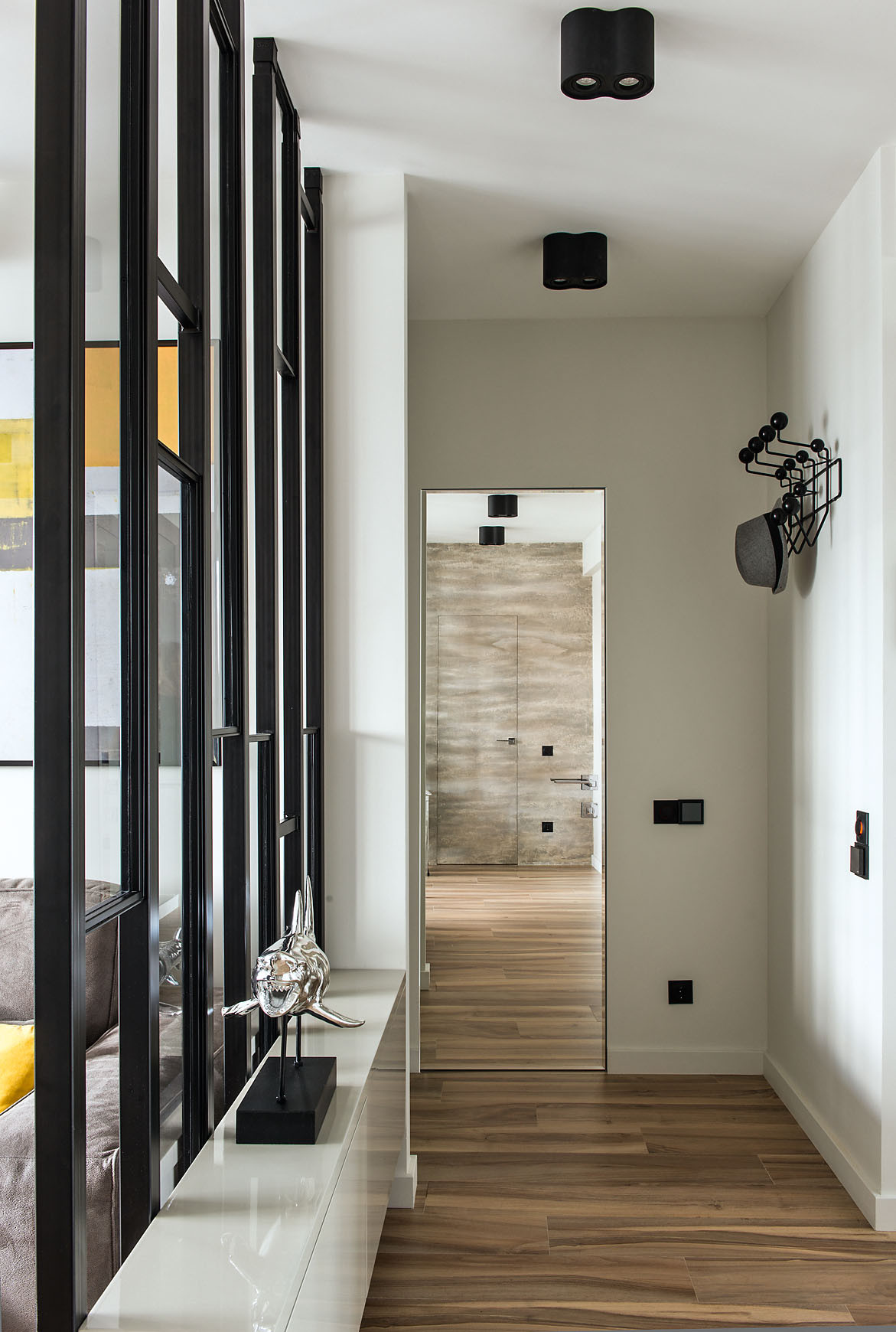 Владельцу хотелось впустить как можно больше живого света в прихожую, и между студией и входной зоной соорудили перегородку из стекла на металлокаркасе, а напротив к стене прикрепили огромное зеркало, улавливающее отражение окна и углубляющее перспективу. Выступающий ригель, портивший облик этой стены, включили в объёмную композицию, созданную с помощью гипсокартона, — получилось подобие портала, придавшего всей конструкции архитектурную завершённость.