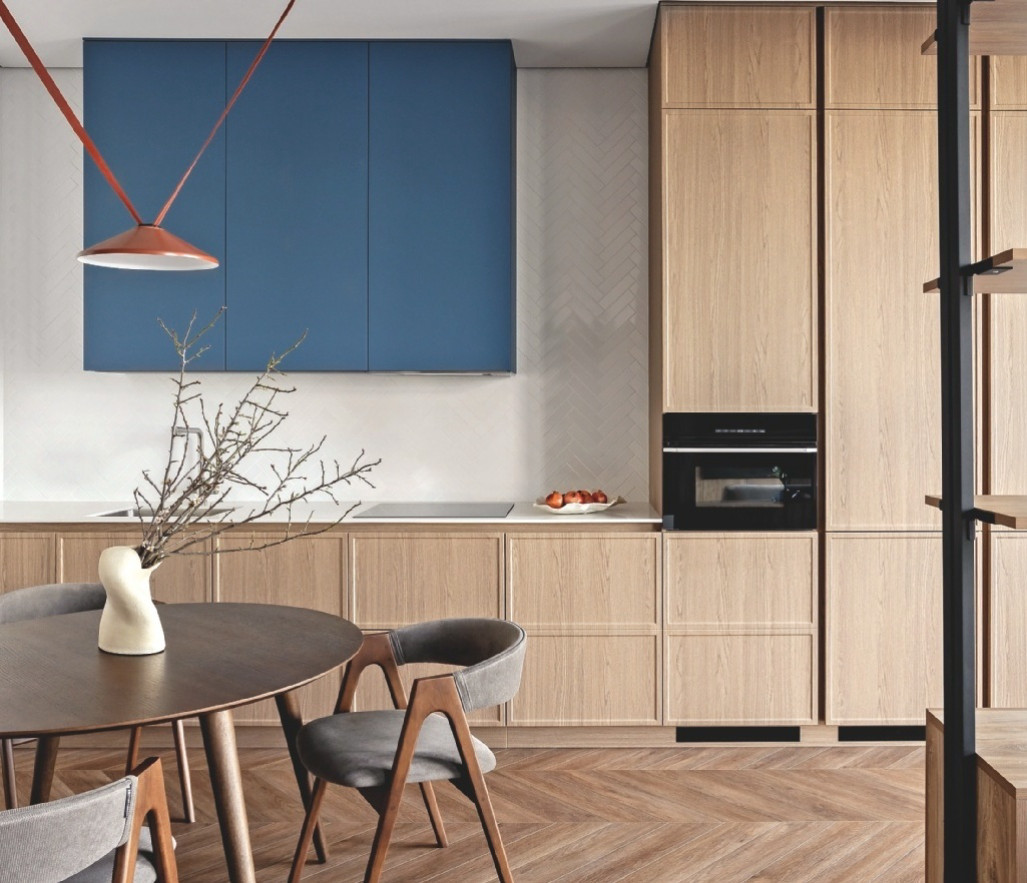 Дизайн. В этом нескучном интерьере соединены тщательно рассчитанные практические решения и эстетика минимализма. Панорамные окна, высокие потолки, архитектору удалось сохранить ощущение простора, не загромождая интерьер лишними деталями, фактурами и яркими красками. Здесь использовано три основных цвета: серый, акцентный синий, белый. Множество текстур, имитирующих дерево, наполняют интерьер природным теплом. Даже деревянный стол и стулья подобраны точно в тон дереву