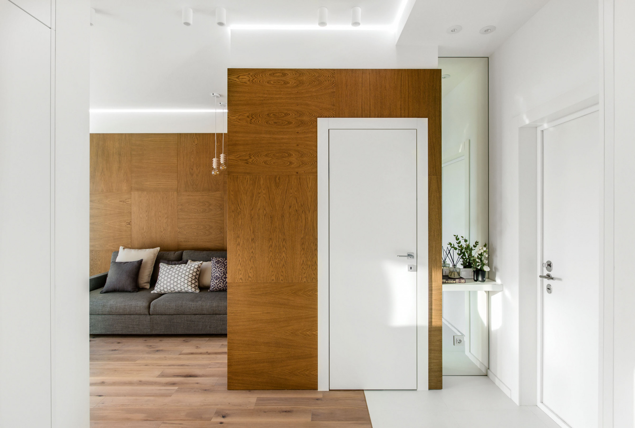 Ремонт. Стяжка, которую выровняли в один уровень с порожком, заняла 10 см. Почти во всех помещениях уложили экологичную инженерную доску, а в душевой, рабочей зоне кухни и прихожей в качестве напольного покрытия выступил керамогранит. Потолки опустили только в зонах, где необходимо было проложить коммуникации: воздуховоды, пожарные датчики, трубы кондиционирования, а также спрятать карнизы для штор. Большинство стен окрасили белой моющейся краской, а часть поверхностей в зоне гостиной отделали панелями из шпона дуба. Окна были установлены застройщиком, но при сдаче дома обнаружились царапины, которые пришлось аккуратно заретушировать. Щитки смонтировали слева от входа и закрыли дверцами из специально изготовленных