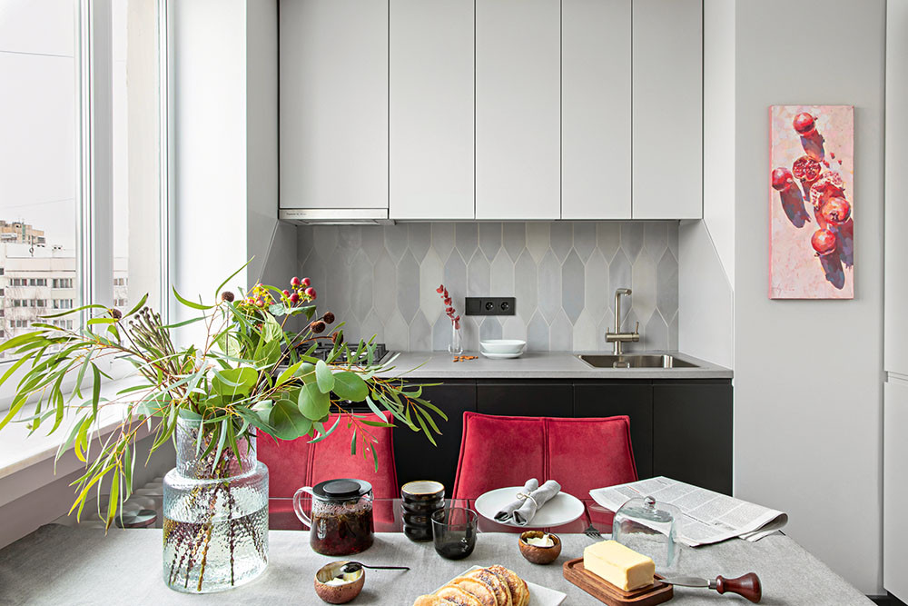 Цветовой акцент — полотно с гранатами, символами плодородия, — добавил кухни «вкуса», выгодно поддержал контрастную гамму. Для заказчика, врача по профессии и отца двух дочерей, изображение имеет сакральный смысл «красной женской нити»