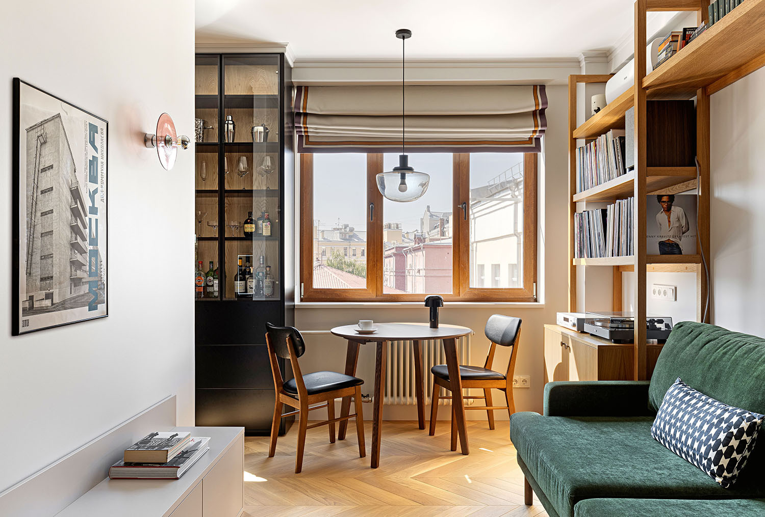 Заказчик — мужчина в расцвете сил, работает в музыкальной индустрии, увлекается искусством, любит собирать друзей на ужины и коктейли. Его желание иметь два стола в маленькой квартире-распашонке — на кухне и в гостиной — для приглашённых дизайнеров прозвучало как вызов. Дело в том, что «распашонки» практически не поддаются перепланировке. При этом такие квартиры имеют ценное преимущество — хорошо проветриваются, так как их окна выходят на противоположные стороны дома.