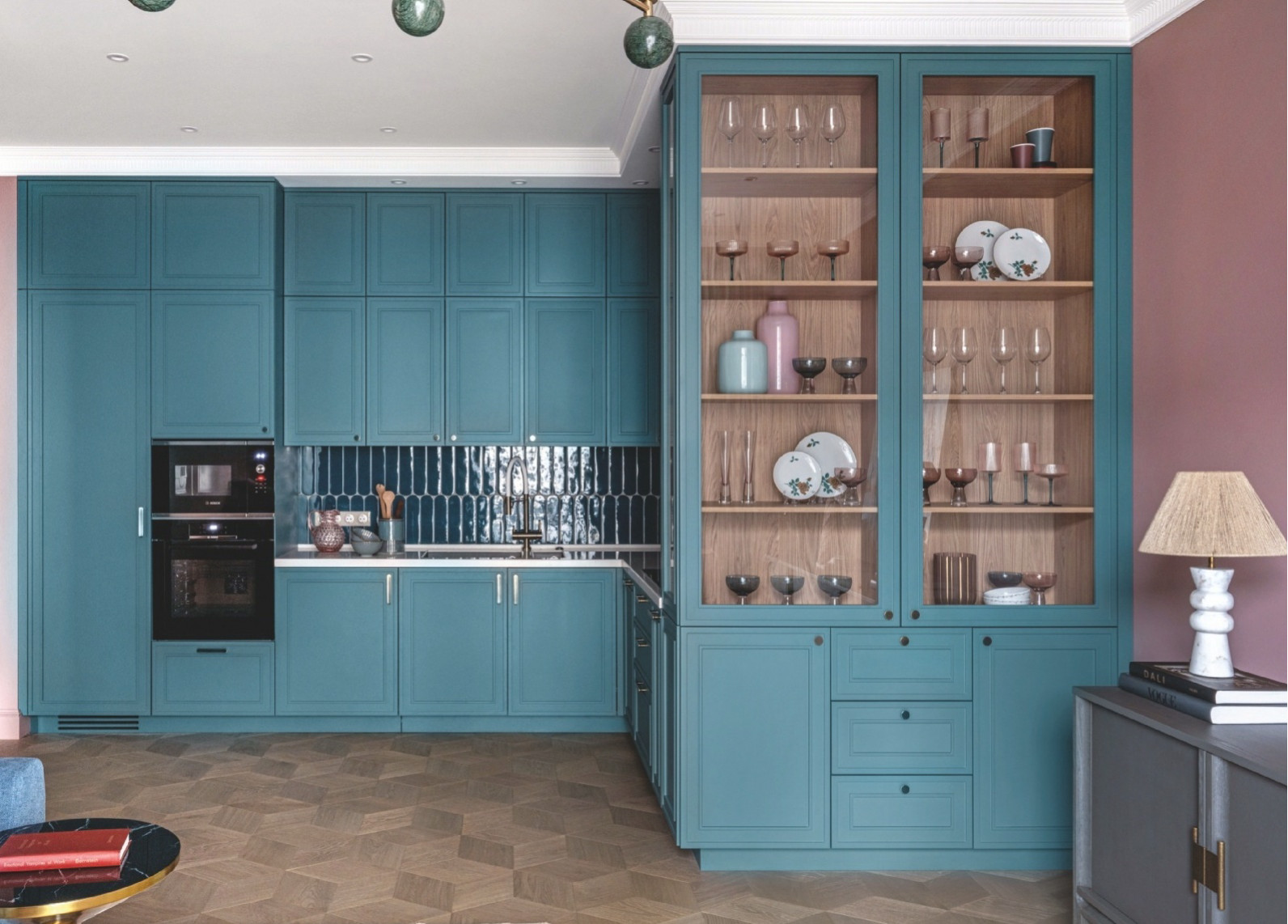 Эта кухня в московской квартире — часть открытого пространства кухни-гостиной, она добавляет уюта и создаёт красивый фон для предметов домашней коллекции
