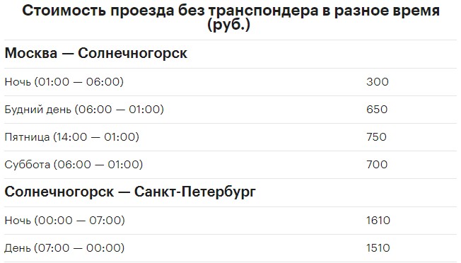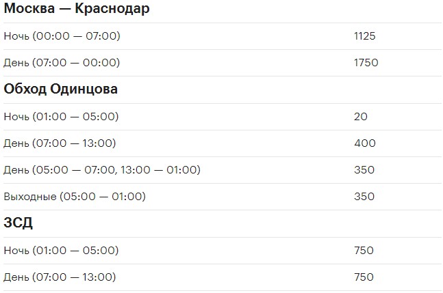 На некоторых участках ночной тариф может быть символическим, а на некоторых мало отличается от дневного. Еще дороже проезд может быть в самые пиковые часы. Например, проезд вечером пятницы из Москвы и вечер воскресенья в город стоит еще дороже, чем днем в будни.