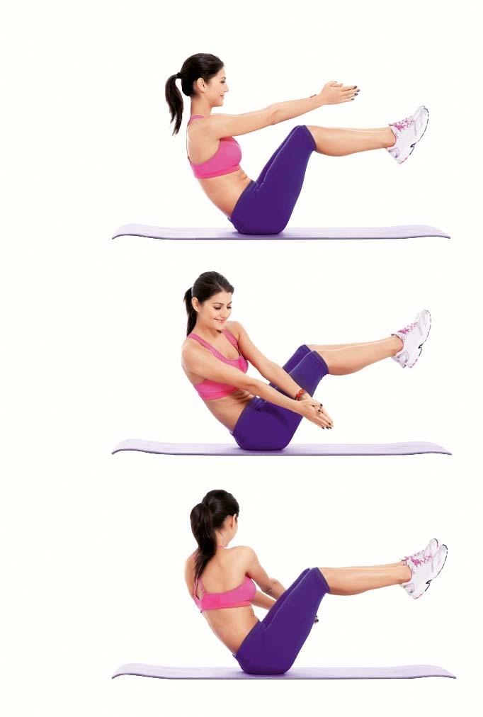 Сидя на ягодицах (выпрями спину и напряги живот!), подними ноги, как показано на фото, и отклонись назад, вытянув руки вперед. Твое тело должно образовать букву V – отсюда и название упражнения. В этом положении (удерживай его не менее 60 секунд) делай скручивания верхней части тела вправо и влево. Повтори еще 3 раза.