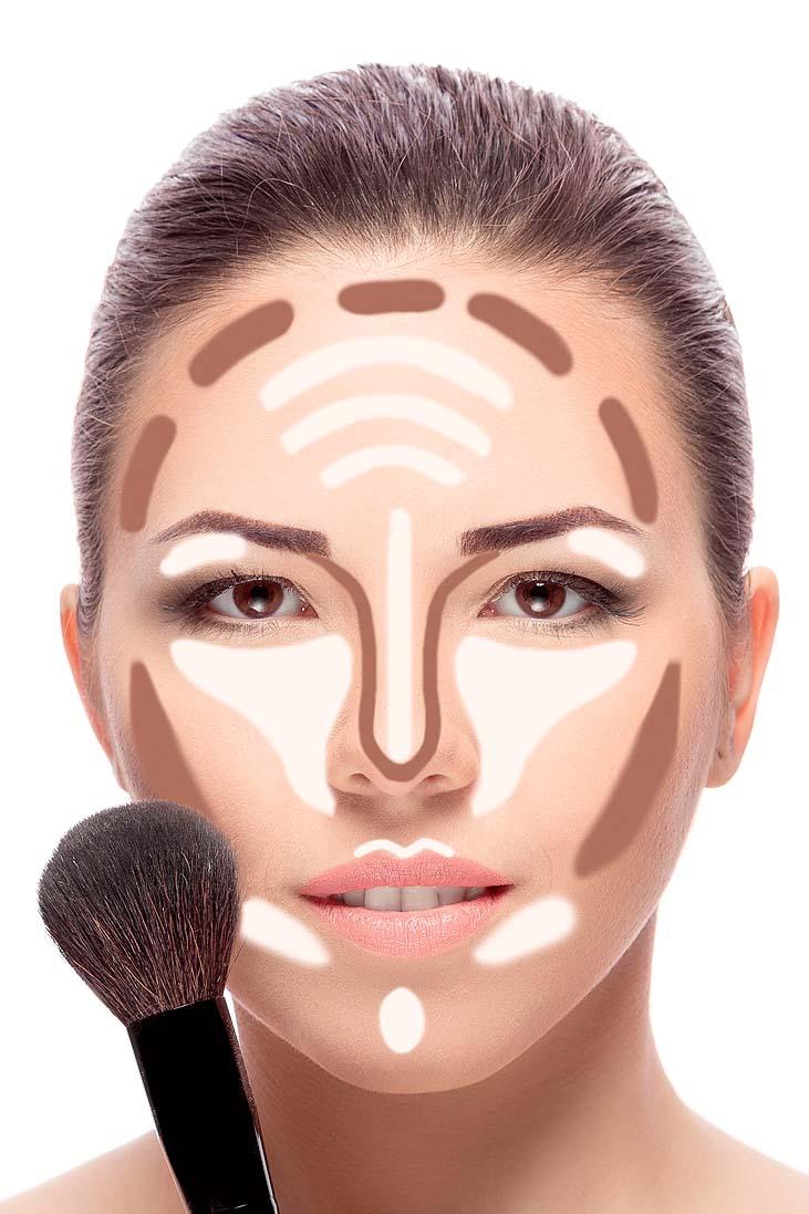 позволяет приблизить овал лица к идеальному с помощью темных и светлых тональных средств. Главный принцип нанесения – светлые корректирующие средства наносятся на выступающие части лица: лоб, надбровные дуги, кончик носа, яблочки щек, подбородок, центр верхней губы, а темные – по границе лица и под скулами.