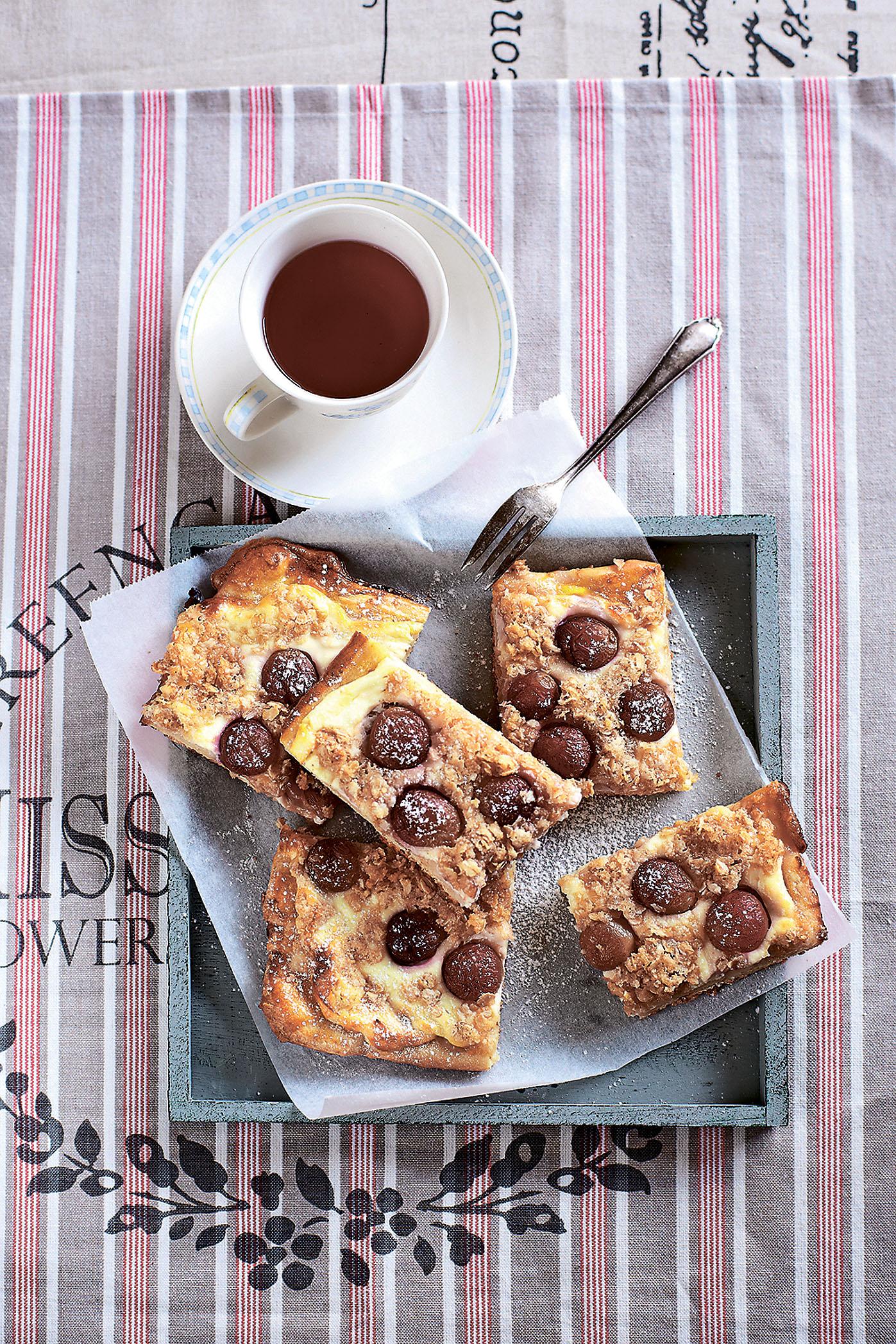 4. Сверху распределить рикотту, отступив от краев около 1 см. Уложить виноград, посыпать оставшейся сахарнолимонной смесью и выпекать около 40 мин. Пирогу дать остыть и перед подачей посыпать сахарной пудрой.