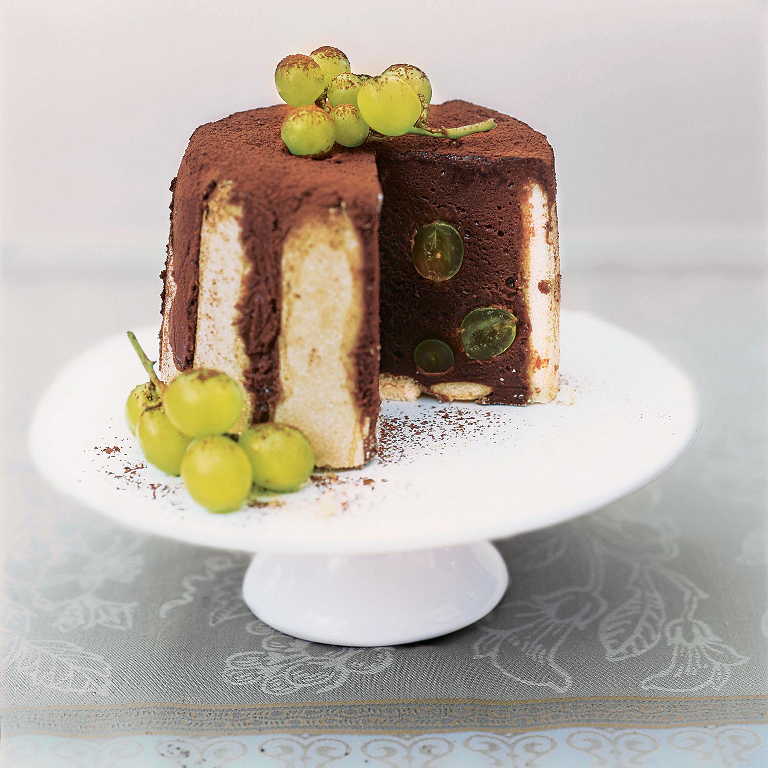 1. Высокую форму (например, для кулича) диаметром 16 см выстлать пищевой пленкой. Дно посыпать 1 ч. л. порошка какао. Виноград вымыть и хорошо обсушить.