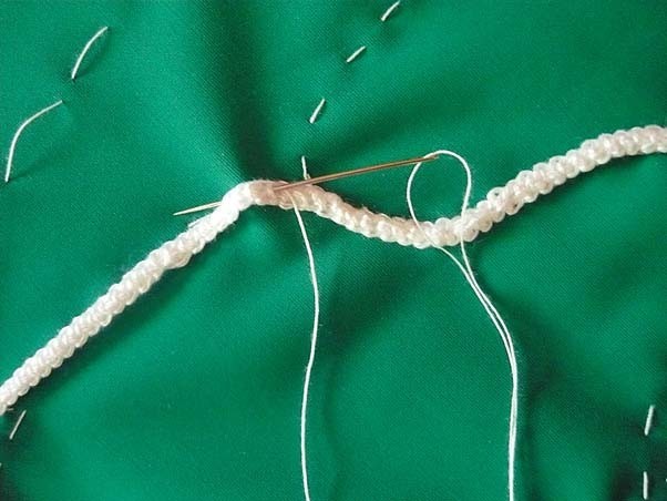 3. Выполняем рисунок на зеленой наволочке. Для этого возьми связанный шнур«гусеничку», приложи к ткани (по заданному контуру) и пришей белыми нитками очень мелкими стежками.