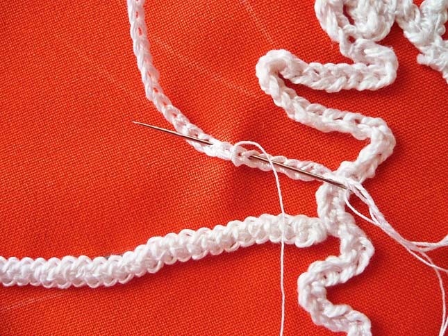 5. Оформляем складочки лепестков и сердцевины цветка. Для этого используй ту же обычную цепочку. Пришей ее к ткани точно так же, как и шнур.