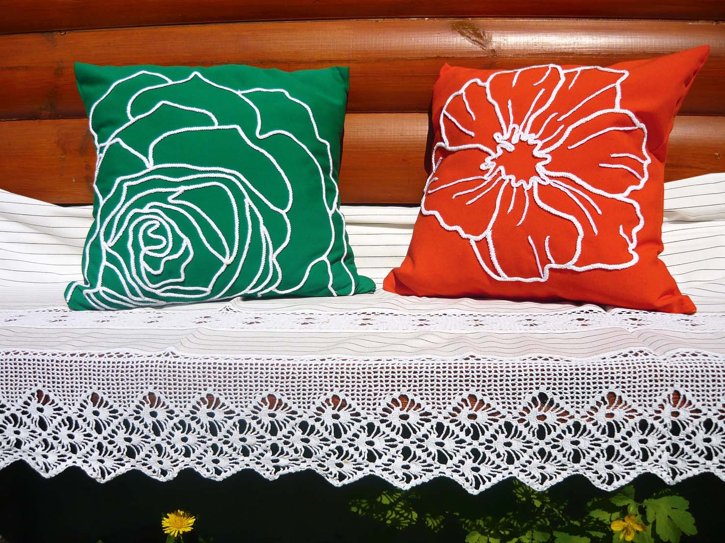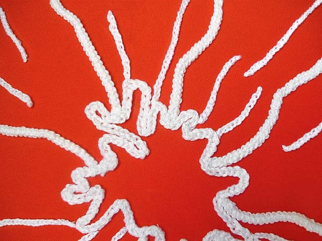 4. Выполняем рисунок на оранжевой подушке. Здесь, наряду с «гусеничкой», используй более тонкий шнурок – обычную цепочку из воздушных петель. Широкий шнур-«гусеничку» применяй для оконтуривания лепестков цветка.