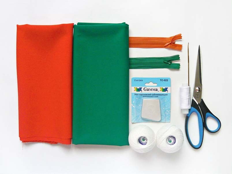 • Однотонные ткани размером 1 х 0,5 м • Две молнии в тон тканей • Портновские ножницы • Пряжа «Ирис» • Мелок портновский • Вязальный крючок • Игла • Нитки