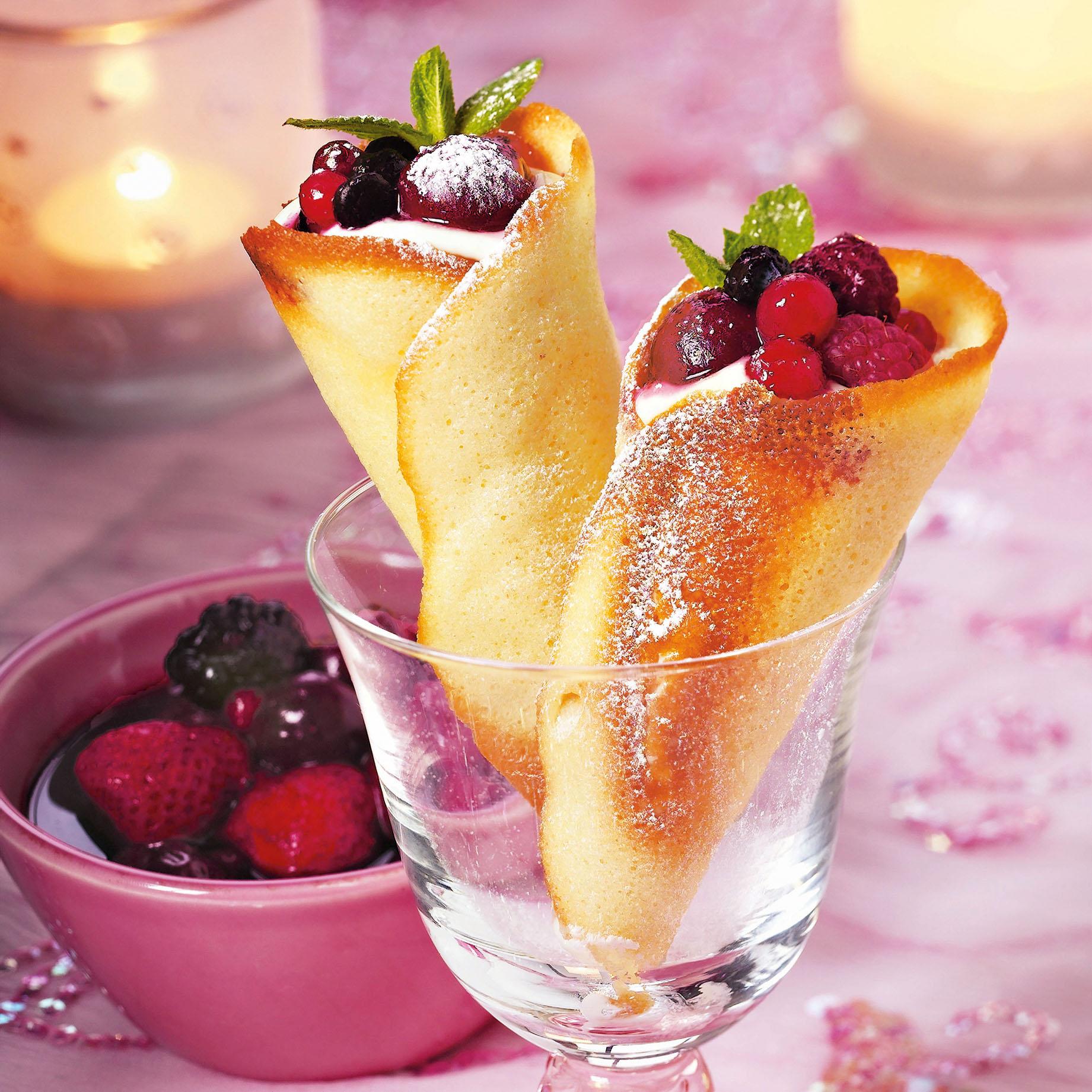 2. Снять горячими и осторожно свернуть кулечками. Дать остыть. Можно наполнить взбитыми сливками или маскарпоне, взбитым с сахарной пудрой, и украсить свежими ягодами.
