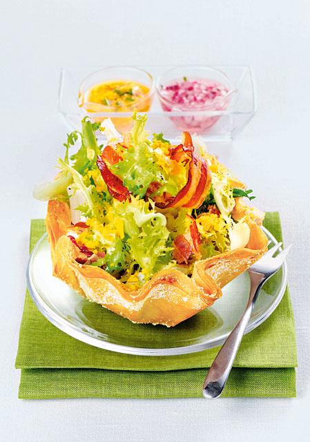 По этому же принципу можно сделать тарталетки из тертого сыра или даже вермишели с сыром (смотри наши рецепты). В них подают как салаты, так и закуски. Можно поместить небольшое количество салата на лепешки и затем аккуратно завернуть начинку. Получится очень необычно. А десертные салаты из не очень влажных фруктов можно подать на домашних вафлях, свернутых кулечками.