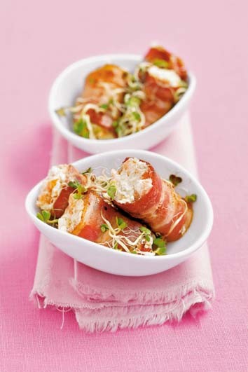 Готовим закуски в виде рулетиков: ветчина с творогом, колбаски в тесте, лосось на овощах.