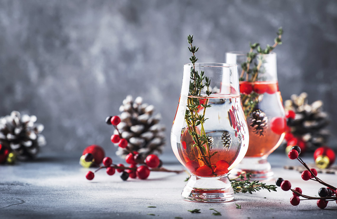 Обычные прозрачные бокалы легко превратить в предметы декора, если налить в них воду, поместить хвойные веточки с маленькими шишками и украсить алой тесьмой. А еще разбросать по скатерти посеребренные шишки и ягоды.