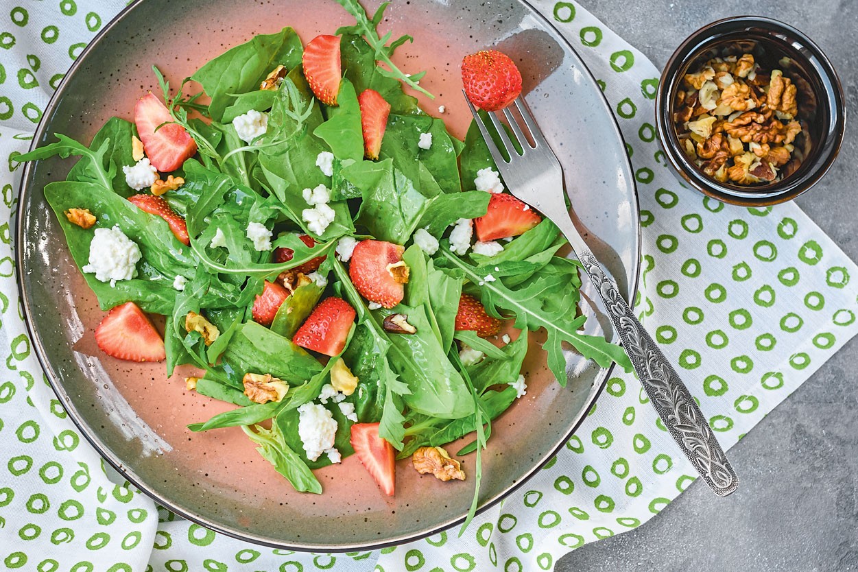Приготовление: Грецкие орехи немного обжарь на сухой сковороде. На тарелку выложи рукколу. Нарежь клубнику небольшими дольками, а сыр – кубиками. Добавь в салат. Приготовь заправку: смешай растительное масло с винным уксусом, медом и специями. Полей салат. Посыпь сверху орехами.