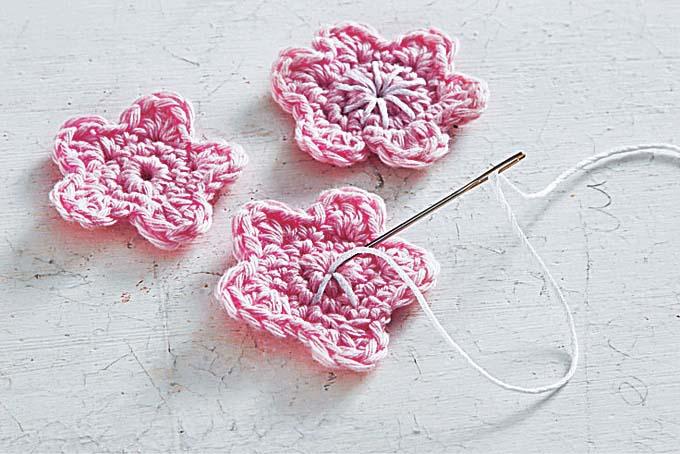 3. Теперь самая интересная часть работы – создание декоративных элементов. Из розовой пряжи свяжи маленькие цветы (15 штук). А из зеленой – листья (10 штук).