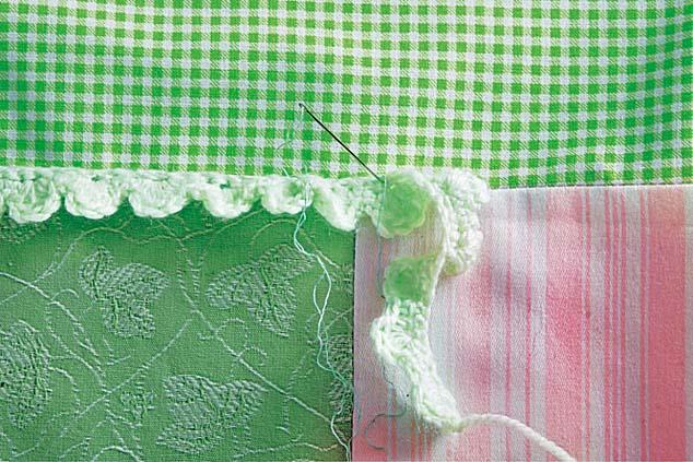 2. Из зеленой пряжи свяжи декоративную тесьму шириной 1,5–2 см (рисунок можешь выбрать любой, в зависимости от навыка в вязании) и аккуратно пришей ее, как это указано на фото.