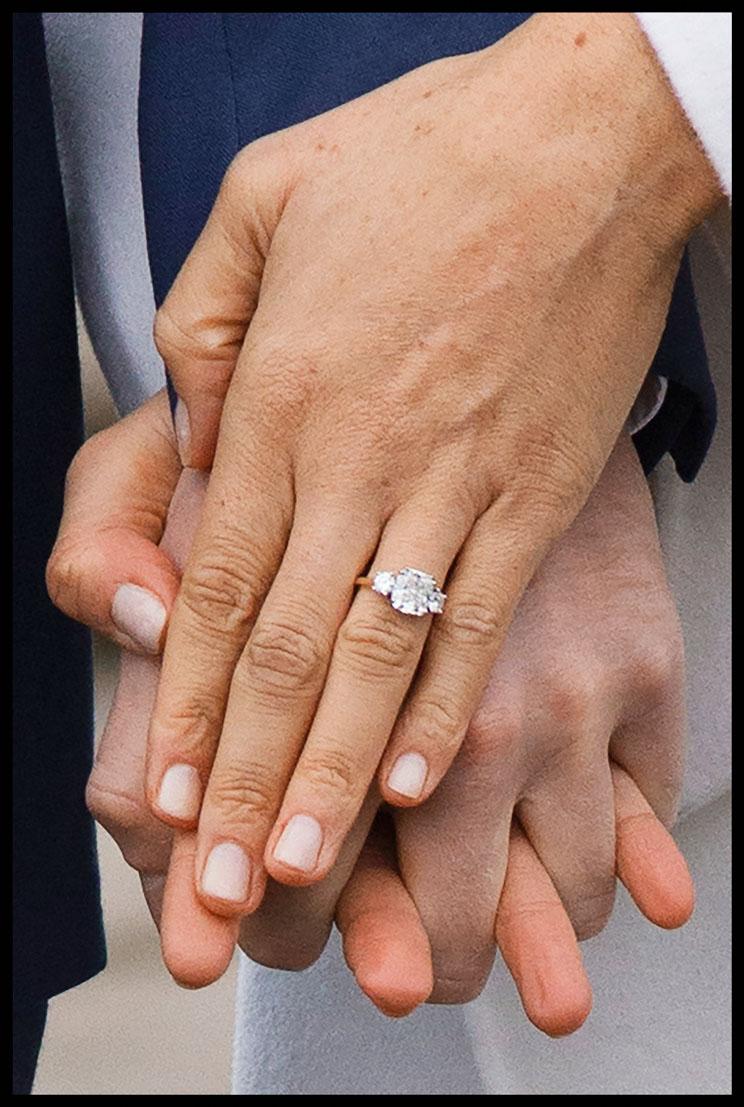 Дизайн помолвочного кольца для Меган принц Гарри придумал сам, а его идею воплотили в жизнь королевские ювелиры. Кольцо из желтого золота украшено тремя бриллиантами. Один, самый крупный, — добыт в Ботсване, где Гарри и Меган «жили в палатке прямо под звездами, часами гуляли и разговаривали». Остальные два бриллианта – наследство принцессы Дианы. «Уверен, если бы мама была жива, они с Меган непременно бы стали подругами. Сейчас я особенно скучаю по ней, хочу поделиться радостной новостью», — признался Гарри. Кольцо принц преподнес будущей жене на кухне. Меган с улыбкой рассказала о помолвке: «Мы жарили курицу на ужин и вдруг он опустился на одно колено. Он был очень милым, естественным и романтичным в этот момент. Я еле дослушала предложение и сразу сказала «Да!».