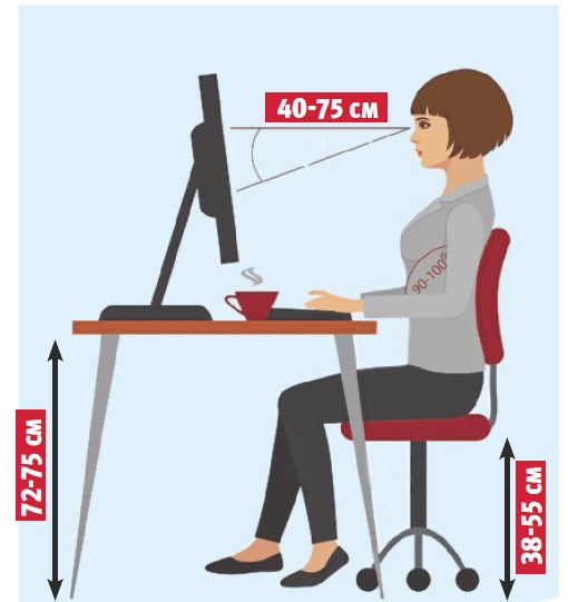 ОТРЕГУЛИРУЙ КРЕСЛО по высоте. Когда ты сидишь, голени должны располагаться перпендикулярно, а бедра – параллельно.