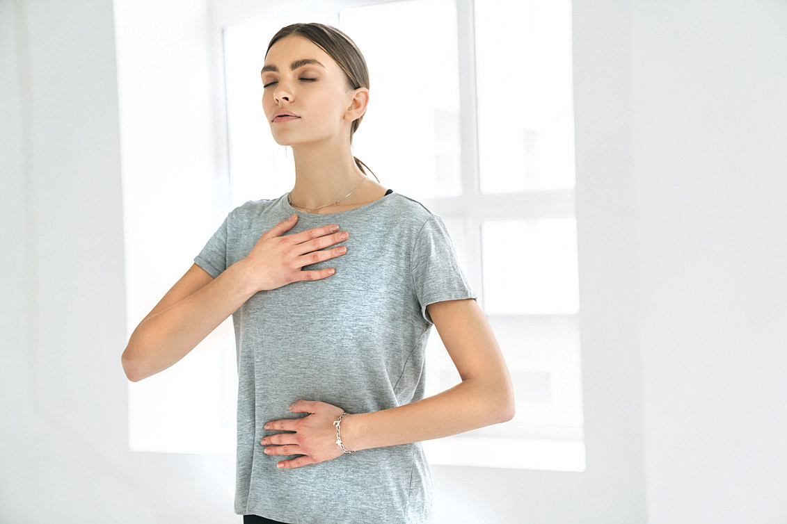 - Упражнение, снимающее тревожность. В этом упражнении вся нагрузка ложится на диафрагму. То есть во время медленного вдоха-выдоха приподнимается и опускается только живот, а грудь остается неподвижной. Подыши так в течение 5 минут.