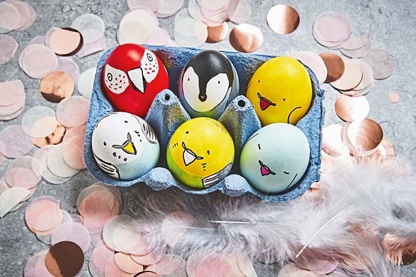 1. Веселые птенцы. Покрась яйца обычным способом и с помощью плотных пищевых красок и кисточки нарисуй глаза и клювики.